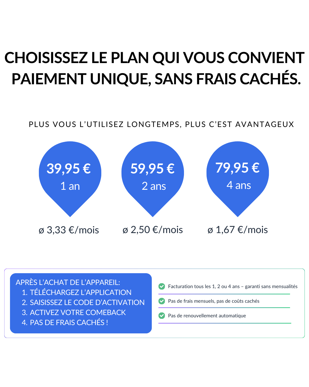 Payez une seule fois et utilisez-le pendant 4 ans maximum. Aucune résiliation nécessaire.